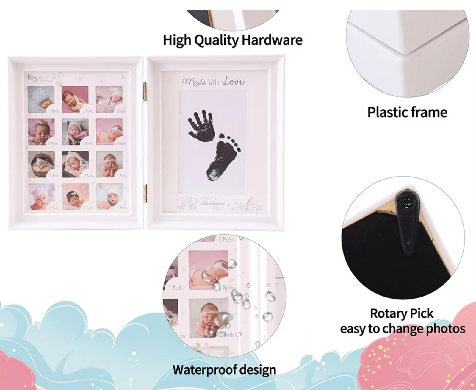 - 0–12 Month Milestone Display – Dedicated photo slots to capture each month of your baby’s first year.