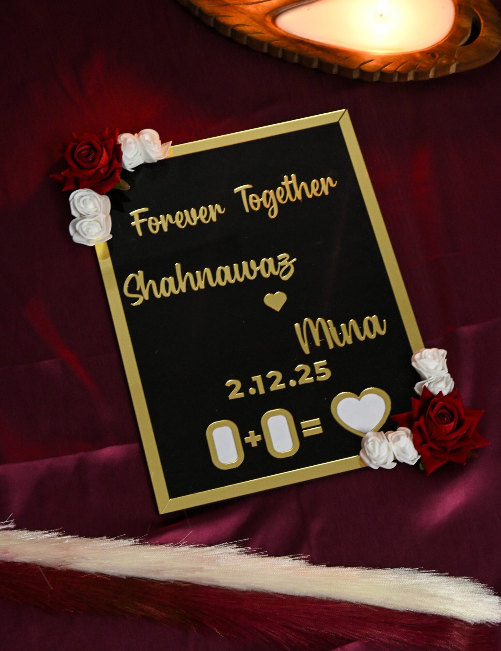 Crafted with a base of high-quality MDF, the Thumb Board offers durability and a premium feel. The surface is designed using high-grade acrylic, giving the board a sleek, glossy appearance that enhances the intricacy of the thumb impression design. Adding to its romantic aesthetic, artificial roses are delicately placed on two corners, creating a beautiful blend of texture, charm, and sophistication.